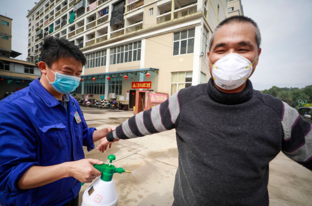 觀察期滿的職工正接受消毒,準(zhǔn)備返崗復(fù)工