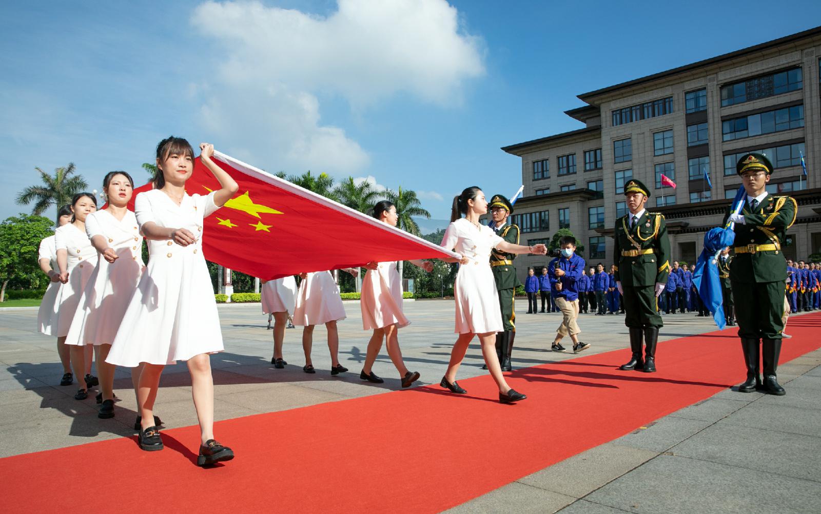 五星紅旗在雄壯的國歌聲中冉冉升起,升旗儀式在全場大合唱《沒有共產(chǎn)黨就沒有新中國》和《三寶之歌》中圓滿完成。