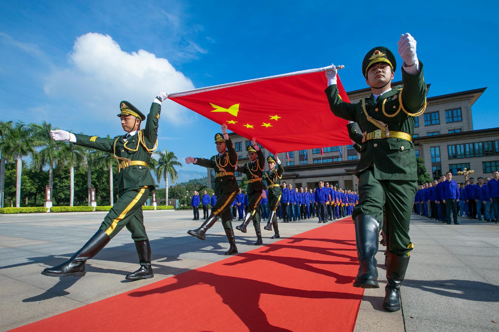 女護(hù)旗手素雅的白裙襯托五星紅旗鮮艷如火,代表著三寶人對黨純潔的初心,護(hù)旗方陣鏗鏘有力的正步,體現(xiàn)三寶力量與鋼鐵人的擔(dān)當(dāng)。